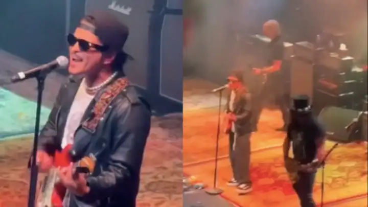 Para a performance, o astro pop foi acompanhado de Slash, o headliner da noite, e Duff McKagan, também do Guns N' Roses, além de Chad Smith, do Red Hot Chili Peppers.